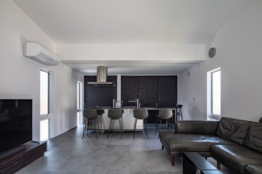 『見せる収納』が苦手という奥様の意見から、キッチンの背面には天井まである壁一面の収納を設え、食器や家電を隠すことですっきりとした印象に。